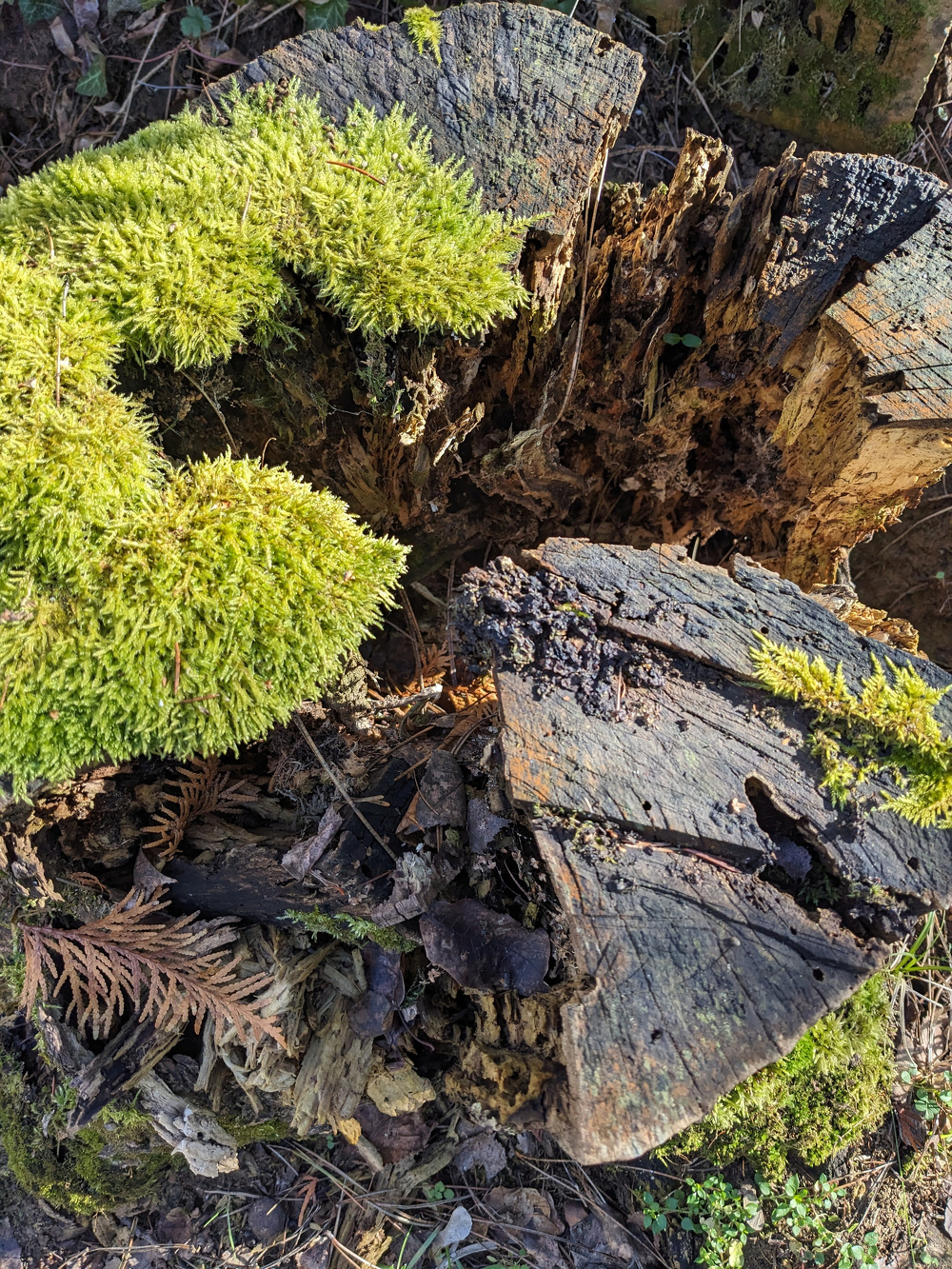 Örököltünk néhány tuskót. Változatos magasságokban lettek elvágva, ezért holtfaságuk is sokféle. Egyikük közel áll a házhoz, és naponta csodálhatjuk, amint évszaktól és időjárástól függően hol így, hol úgy meglepi az élet. És minket is.